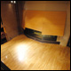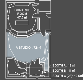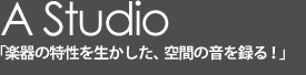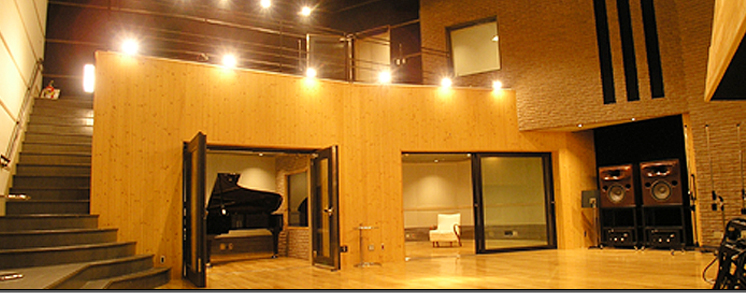 ウッディな内装と平均天井高6.5mの傘状拡散天井構造のAスタジオは、メインフロアーと4つのブース(前室含む)のある広々とした空間です。幅広い音づくりができ、リズム録りから弦の録音まで多彩な音響スペースを提供します。