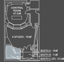 ドラム、ベース、ギター、ヴォーカルなど様々な楽器の録音に適した音響特性を持つBoothで、メインフロアやコントロールルーム間でも容易にコミュニケーションが図れる多種多様なBooth。